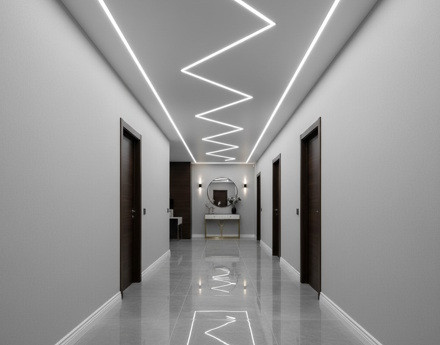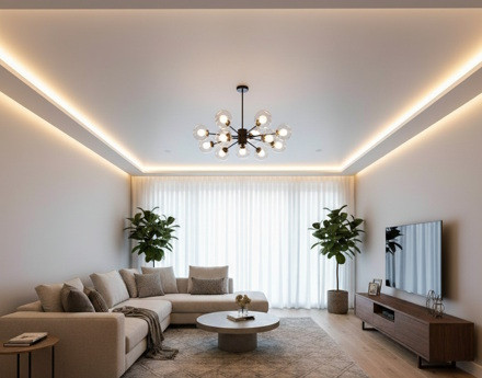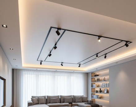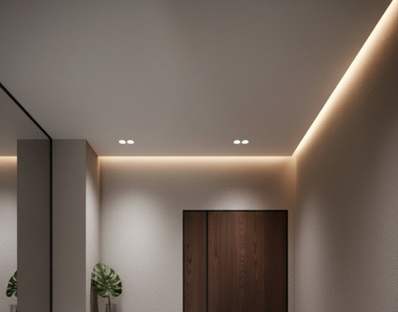 Встроенный карниз – это декор со светильниками внутри, а еще возможность повесить шторы.