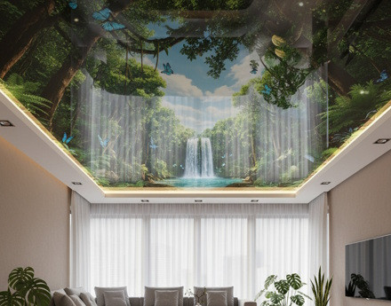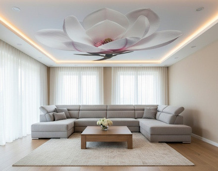 Сатиновый, матовый или глянцевый потолок очень просто превратить в декоративный элемент интерьера. Достаточно нанести фотопечать, сделать конструкцию двухуровневой или многоуровневой, установить встроенные светильники. В кухне, спальне, ванной, коридоре — везде такая потолочная отделка станет украшением. Удачное освещение справится с зонированием пространства.