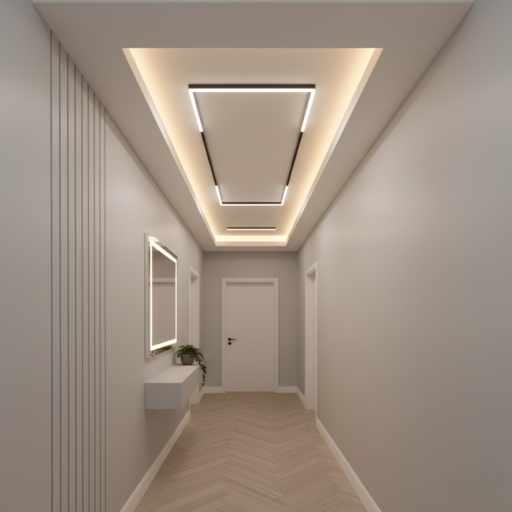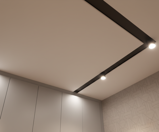 Ниши монтируются вровень с потолком, снабжены светодиодными лентами, встроенными внутрь профиля, который рассеивает их свет своей белой частью. Если профиль черного цвета, в него встраиваются точечные поворотные светильники споты.