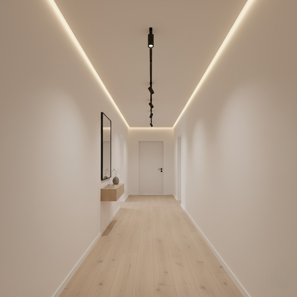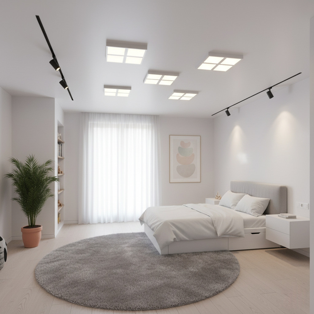 Споты, которые устанавливаются на шинопровод, легко скользят вдоль трека, поворачиваются, освещая любую точку комнаты.