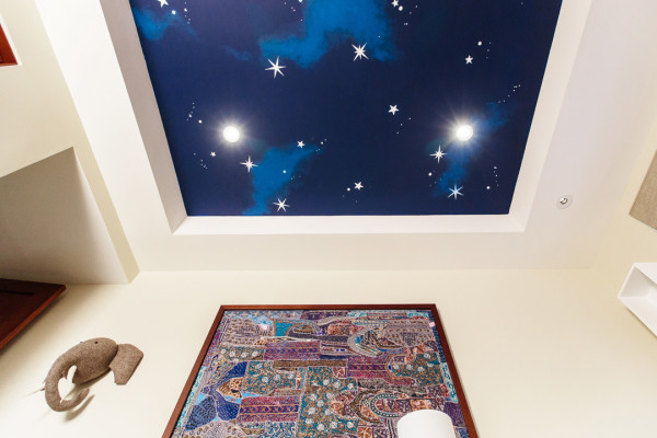 - Эстетика – пространство ребенка отличается от комнаты взрослых цветами и тематикой оформления. С помощью печати на натяжном потолке вы создадите в детской имитацию неба в звездах или облаках, украсите полотно изображениями любимых ребенком сказочных героев;
