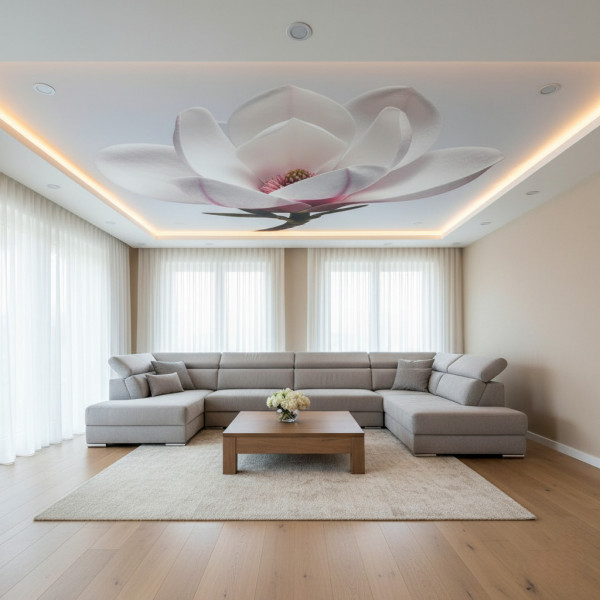 Ткань пропускает воздух, хорошо смотрится с печатью, монтируется без тепловой пушки. Последний пункт может быть принципиален, если в вашей гостиной есть крупные музыкальные инструменты, антикварные предметы мебели, картины, которые нельзя ни вынести, ни перегревать. В этом случае тканевый потолок станет лучшим решением.