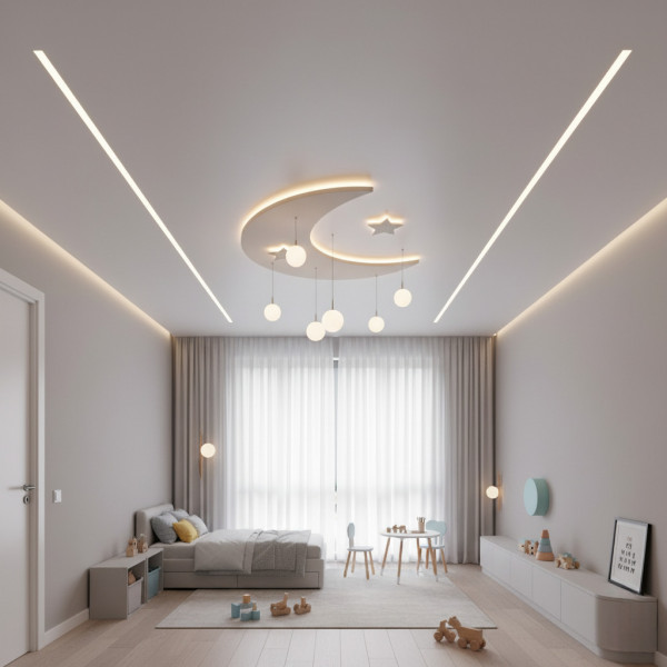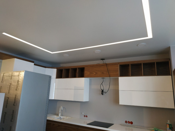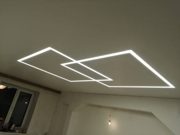 Монтируются профили к стенам, ведется проводка для световых линий, закрепляется профиль, в котором выкладывается светодиодная лента. Поверх она закроется светопрозрачными заглушками или полупрозрачной пленкой. При выключенном свете потолок будет белым, а стоит включить электричество, как на нем проявятся линии и другие геометрические фигуры.